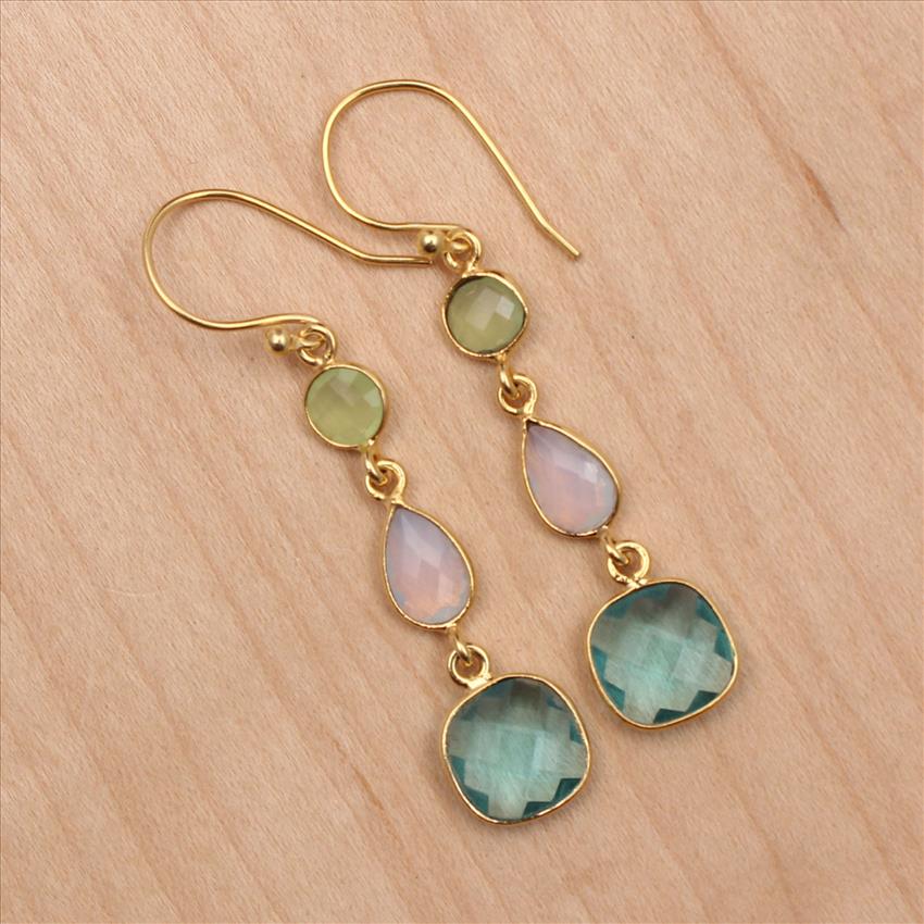 Agate, Opalite, Fuchsia Multi Color Gemstone Dangle Hook Style Gold Plated Statement Earrings Supply Jewelry (EJ-2727)